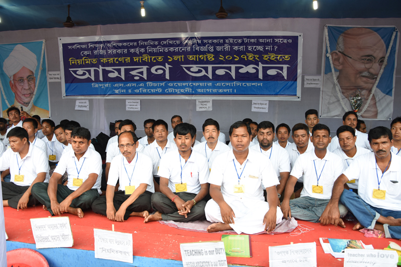 নিজস্ব প্রতিনিধি, আগরতলা, ২ আগস্ট৷৷ সর্বশিক্ষায় নিযুক্ত শিক্ষকদের নিয়মিতকরণের বিষয়টিকে কেন্দ্রের কোর্টে ঠেলে দিয়ে আন্দোলনকারীদের আমরণ অনশন প্রত্যাহারের আর্জি জানিয়েছে রাজ্য সরকার৷ প্রশাসনের তরফ থেকে চুক্তিবদ্ধ শিক্ষক – অশিক্ষক কর্মচারীদের নিয়মিতকরণ সম্পর্কে প্রেস নোট জারী করা হয়েছে বুধবার৷ তাতে উল্লেখ করা হয়েছে, সর্বশিক্ষা মিশন ও রাজ্য সরকার এই প্রকল্পে নিযুক্ত চুক্তিবদ্ধ শিক্ষক ও অশিক্ষক কর্মচারীদের জীবন ও জীবিকার প্রতি সম্পূর্ণভাবে সহানুভূতিশীল৷ চুক্তিবদ্ধ শিক্ষক-কর্মচারীদের যাবতীয় সমস্যা সরকার মানবিক ও ইতিবাচক দৃষ্টিভঙ্গী নিয়েই বিবেচনা করছে৷ কিন্তু এই চুক্তিবদ্ধ শিক্ষক শিক্ষিকাদের চাকুরীর নিয়মিতকরণের বিষয়টি নিয়ে বিভিন্ন মহলে থেকে উদ্দেশ্যপ্রণোদিতভাবে বিভ্রান্তি ছড়ানোর চেষ্টা করছে৷ বলা হচ্ছে, এই শিক্ষকদের নিয়মিত দেখিয়ে কেন্দ্রীয় সরকার থেকে অর্থ আনা হচ্ছে, যা সম্পূর্ণভাবে অসত্য ও ভিত্তিহীন৷ রাজ্য সরকার এখনও পর্যন্ত কোন চুক্তিবদ্ধ শিক্ষক-শিক্ষিকাকেই নিয়মিত করেনি৷ শুধুমাত্র চাকুরীর মেয়াদ ৫ বছর পূর্ণ হলে তাদের জন্য নিয়মিত শিক্ষক-শিক্ষিকাদের সমহারে বেতন প্রদান করার জন্য বার্ষিক পরিকল্পনাতে কেন্দ্রীয় সরকারের কাছে অর্থ বরাদ্দ করার জন্য প্রস্তাব করা হয়৷ এর অর্থ এই নয় যে, রাজ্য সরকার তাদেরকে নিয়মিত করে ফেলেছে৷ অন্যদিকে এরকমও বলা হচ্ছে যে, দেশের বিভিন্ন রাজ্য সর্বশিক্ষার শিক্ষকদের নিয়মিত করা হয়েছে, শুধুমাত্র ত্রিপুরা সরকার এদের নিয়মিত করছে না৷