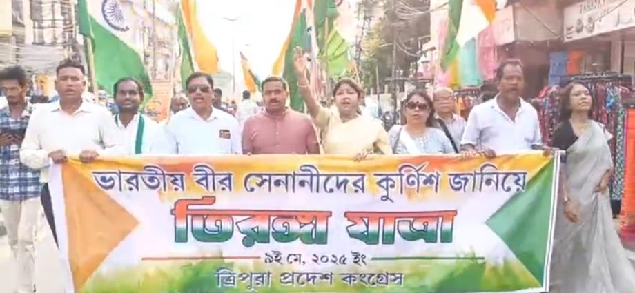 আগরতলা, ৯ মে : ত্রিপুরা প্রদেশ কংগ্রেসের উদ্যোগে ভারতীয় বীর সেনাবাহীনিদের কুর্নিশ জানিয়ে আগরতলা শহরে এক সুবিশাল তিরঙ্গা রেলির আয়োজন করা হয়েছে। এদিনের রেলিটি প্রদেশ কংগ্রেস ভবনের সামনে থেকে শুরু হয়ে শহরের বিভিন্ন পথ পরিক্রমা করে।