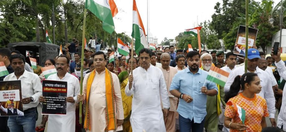 আগরতলা, ১৪ মে: ভারতমায়ের বীর সৈনিকদের প্রতি শ্রদ্ধা জানিয়ে আগরতলার রাজপথে প্রদেশ বিজেপির তরফ থেকে তিরঙ্গা যাত্রা বের করা হয়েছে। এদিনের যাত্রা শহরের বিভিন্ন পথ পরিক্রমা করে। এদিনের তিরঙ্গা যাত্রায় উপস্থিত ছিলেন মুখ্যমন্ত্রী অধ্যাপক (ডা.) মানিক সাহা, সাংসদ রাজীব ভট্টাচার্য্য, মন্ত্রী টিংকু রায়, বিধায়ক মীনা রানী সরকার সহ অন্যান্যরা।