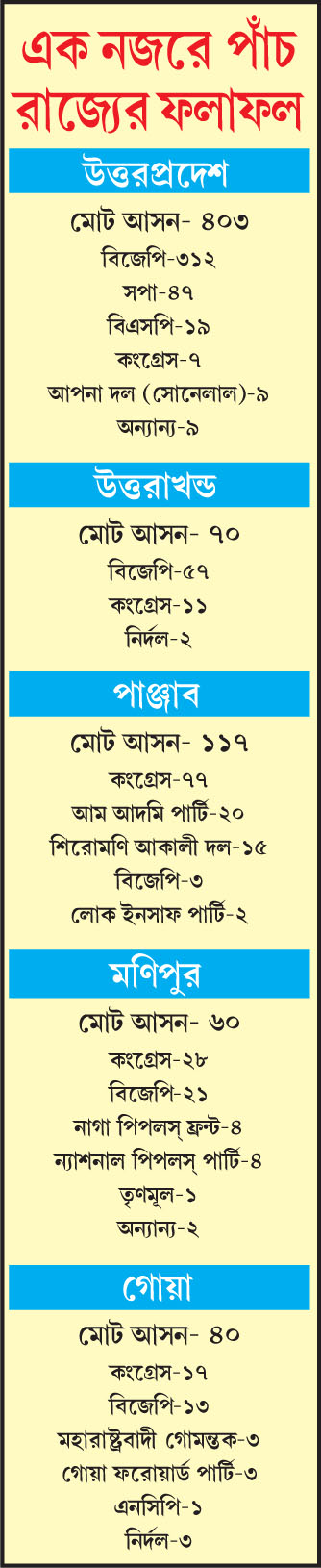 সব মিলিয়ে উত্তরপ্রদেশ এবং উত্তরাখন্ড দুই দেবভূমিতে বিজেপি সরকার গঠন নিশ্চিত হয়ে যাওয়ার পর এখন মণিপুর এবং গোয়াতে কোন দলের সরকার গড়বে তা এখন সময়ের অপেক্ষা৷ তবে, পাঁচ রাজ্যের নির্বাচনের ফলাফলে স্পষ্ট বিজেপি অপ্রতিহত৷