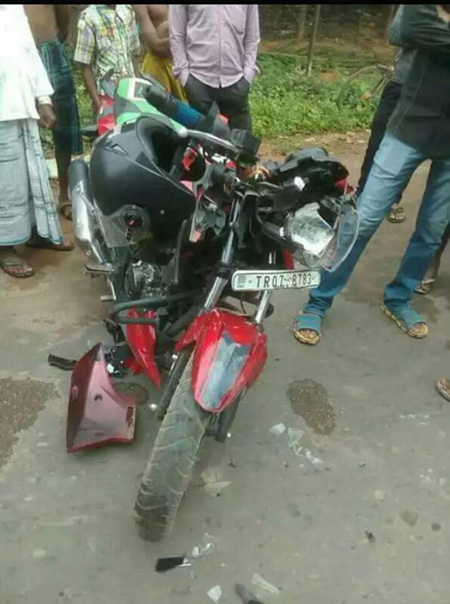 অন্যদিকে, ফের রক্তে লাল হল বিশালগড়-কামথানা রোড৷ দূর্ঘটনাটি ঘটেছে বিশালগড় থানার অধীন কড়ইমুরা নজরুল চৌমুহনিতে৷ দুর্গানগর থেকে বিশালগড়ের দিকে আসছিল টিআর০৭-৮৭৮৩ বাইকটি৷ অপরদিকে মুড়াবাড়ি থেকে কড়ইমুরা যাচ্ছিল বুলেরো পিকআপ ভ্যান৷ বাইক ও বুলেরো পিকআপ ভ্যামের মুখোমুখি সংঘর্ষে ঘটে৷ ঘটনাস্থলে বাইক আরোহী নিত্যানন্দ ভৌমিক (২৭) ও তার ভাই সুশান্ত ভৌমিক (২৫) গুরুতর আহত অবস্থায় মাটিতে লুটিয়ে পড়ে৷ বাইক চালক নিত্যানন্দ ভৌমিকের মাথা ফেটে যায়৷ সাথে সাথে দমকল বাহিনী এসে তাদের উদ্ধার করে বিশালগড় হাসপাতালে নিয়ে যায়৷ নিত্যানন্দের অবস্থা বেগতিক দেখে জিবি হাসপাতালে রেফার করা হয়৷ ভ্যান চালক ময়নাল হোসেন (৩৫) দুর্ঘটনার পরই গাড়িটি নিয়ে পালিয়ে যায়৷ নিত্যানন্দকে উন্নত চিকিৎসার জন্য বহিঃরাজ্যে নেওয়া হবে পরিবার সূত্রে খবর৷ অন্যদিকে এলাকাবাসীর অভিযোগ এই সড়কটিতে ঘন ঘন দুর্ঘটনা ঘটলেও পুলিশ যথাযথ কোন ভূমিকা গ্রহণ না করায় বারবার ছোটবড় দুর্ঘটনা ঘটছে৷