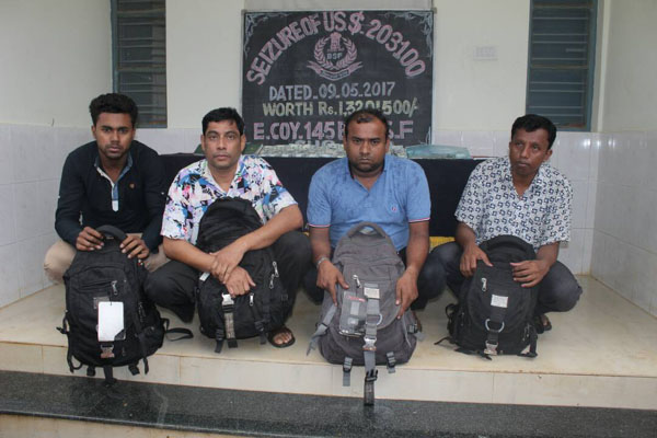 বাংলাদেশী নাগরিককে আটক করে৷ ধৃতরা হল, আবুল কালাম আজাদ (১৯), পরিমহল সাহা (৩৭), মহম্মদ আলি (৩৭) এবং সাজিবুর রহমান (৪৬)৷ তাদের প্রত্যেকের বাড়ি বাংলাদেশের কুমিল্লা জেলার বুড়িচাং থানা এলাকায়৷ ধৃতরা বিএসএফের কাজে স্বীকার করেছে যে, আট মে তারা শ্রীমন্তপুর এলাকা দিয়ে সীমান্ত অতিক্রম করে রাজ্যে প্রবেশ করে৷ বিএসএফের পক্ষ থেকে ধৃত চারজনকে আগরতলা ল্যান্ড কাস্টমস এর হাতে তুলে দিয়েছে৷ সংশ্লিষ্ট কতৃপক্ষ ধৃতদের জিজ্ঞাসাবাদ চালিয়েছে৷ জানা গিয়েছে, এই চার বাংলাদেশী নাগরিকের সাথে কলকাতার একটি চক্র জড়িত রয়েছে এই আন্তর্জাতিক মুদ্রা চোরাচালানে৷ ল্যান্ড কাস্টমস কতৃপক্ষ বিষয়টি নিয়ে কলকাতা অফিসের সাথেও যোগাযোগ করছে বলে জানা গিয়েছে৷ এদিকে, প্রশ্ণ উঠেছে, কলকাতা ও আগরতলা বিমান বন্দর কতৃপক্ষের নজর এড়িয়ে কিভাবে এই চোরাকারবারীরা বিপুল পরিমানে মার্কিন ডলার বহন করল৷ তাও আবার সরকার নিয়ন্ত্রিত একটি বিমান সংস্থার৷