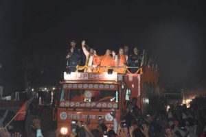 এদিকে, ধর্মনগরে যোগী আদিত্যনাথের সফরকে কেন্দ্র করে সমগ্র জেলাায় গেরুয়া ঝড় বইছে৷ ধর্মনগর থেকে যুবরাজনগর পর্যন্ত যোগী আদিত্যনাথের রোড শোতে অভূতপূর্ব সাড়া মিলেছে বলে খবর৷ সাজোয়া রথে উত্তরপ্রদেশের মখ্যমন্ত্রী যোগী আদিত্যনাথ স্থানীয় বিজেপি প্রত্যাশীদের সঙ্গে নিয়ে ধর্মনগর থেকে যুবরাজনগরের উদ্দেশে রওয়ানা দেন৷ বিজয় সংকল্প রথের সামনে পেছনে বিজেপির কর্মী সমর্থক ছাড়াও অসংখ্য সাধারণ জনগণ যাত্রায় শামিল হন৷ যোগী আদিত্যনাথের রথকে অনেক জায়গায় বেশ কিছুক্ষণের জন্য দাঁড়াতে হয়েছে৷ জনগণের আবদারে যোগী আদিত্যনাথ রথ থেকে নেমে এসে দাঁড়াতেই তাঁর চরণ স্পর্শ করার জন্য হুড়োহুড়ি লেগে যায়৷ কয়েকবার এমন হওয়ার পর অঘটন এড়ানোর জন্য করজোড়ে তিনি সবার কাছে এমনটা না করার আবেদন
