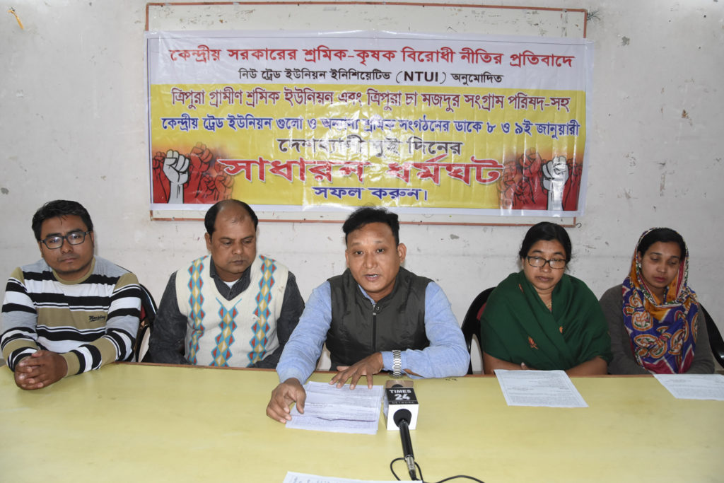নিজস্ব প্রতিনিধি, আগরতলা, ১ জানুয়ারী৷৷ আগামী আট ও নয় জানুয়ারী সারা দেশে ধর্মঘটের ডাক দিয়েছে ১০টি ট্রেড ইউনিয়ন সহ বিভিন্ন শ্রমিক সংগঠন৷ ধর্মঘটের সমর্থনে ইতিমধ্যেই বিভিন্ন রাজনৈতিক দলগুলি এগিয়ে েেসছে৷ এক সাংবাদিক সম্মেলনে বুধবার আগরতলায় প্রেস ক্লাবে ট্রেড ইউনিয়ন ইনিশিয়েটিভ অনুমোদিত ত্রিপুরা গ্রামীণ শ্রমিক উন্নয়ন এবং ত্রিপুরা চা মজদুর সংগ্রাম পরিষদের যৌথ আহ্বানেও আগামী ৮ ও ৯ জানুয়ারী সর্বভারতীয় সাধারণ ধর্মঘটে সামিল হবার আহ্বান জানানো হয়েছে৷