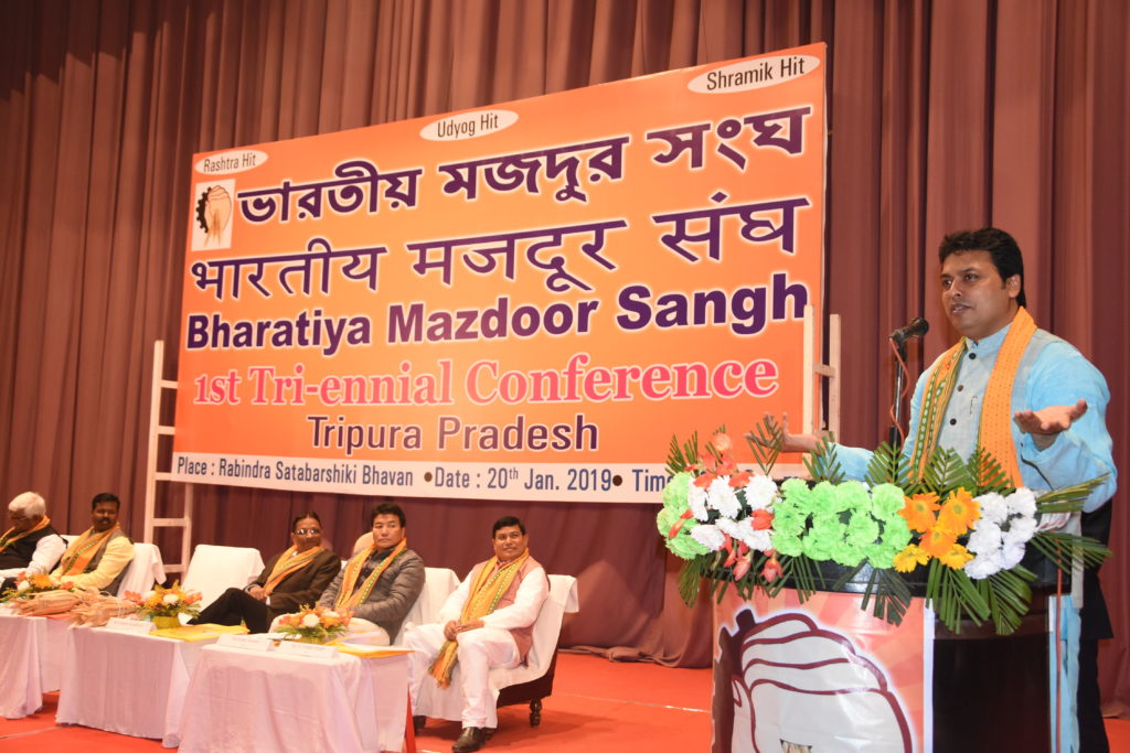 নিজস্ব প্রতিনিধি, আগরতলা, ১৯ জানুয়ারি ৷৷ স্বামী বিবেকানন্দ বলেছিলেন ব্যক্তি বড় নয়, দায়িত্ব বড়৷ ভারতীয় মজদুর সংঘের ভাইয়েরা এই মানসিকতা নিয়েই কাজ করে যাচ্ছে৷ রবিবার আগরতলার রবীন্দ্র শতবার্ষিকী ভবনে বিএমএস এর রাজ্য সম্মেলনে একথা বলেছেন মুখ্যমন্ত্রী বিপ্লব কুমার দেব৷ তিতিন সার্বিকভাবে প্রথমবারের মতো রাজ্যে অনুষ্ঠিত ভারতীয় মজদুর সংঘ ত্রিপুরা রাজ্য শাখার রাজ্য সম্মেলনে বিএমএস কর্মীদের ভুূয়সী প্রশংসা করেছেন৷ সম্মেলনের উদ্বোধন করে এদিন মুখ্যমন্ত্রী বলেছেন, বিএমএস কর্মীদের সক্রিয় ভূমিকার কারণেই গত ৮ এবং ৯ জানুয়ারি দেশব্যাপী যে ধর্মঘটের ডার দিয়েছিলো ১০টি শ্রমজীবি সংগঠন, তার সফলতা আসেনি৷ যে কারণে রাজ্য তথা দেশের কোষাগাড়ে কোটি কোটি টাকা সংরক্ষণও সম্ভব হয়েছে৷ এদিন রাজ্যকে আগামী ৩ বছরের মধ্যে মডেল রাজ্য হিসেবে গড়ে তুলতে গেলে, ই রিকশা, অটো রিকশা এবং অন্যান্য শ্রমিক সংগঠনেরও যে একত্রিত প্রয়াস জরুরি তা জানালেন মুখ্যমন্ত্রী৷ বলেছেন, রাজ্য সরকার এখনও সেই দিশাতেই এগোচ্ছে৷