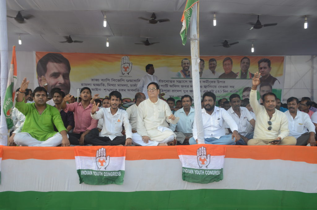 লোকসভা নির্বাচনের ফলাফল ঘোষণার পক্ষকাল অতিবাহিত হওয়ার পরও রাজ্যে বিরোধীদলের নেতা কর্মী সমর্থকদের উপর শাসক বাহিনীর হামলা হুজ্জুতি ও সন্ত্রাস বন্ধ হয়নি৷ বিরোধীদল কংগ্রেসের নেতা কর্মীদের মিথ্যা মামলায় ফাঁসিয়ে হয়রানী করা হচ্ছে৷ কংগ্রেসের দলীয় অফিস জবর দখল, ভাঙচুর ও অগ্ণিসংযোগ করা হচ্ছে৷ পরিস্থিতি মোকাবিলায় রাজ্য সরকার কঠোর মনোভাব গ্রহণ করছে না বলে অভিযোগ যুব কংগ্রেসের৷ এরই প্রতিবাদে রবিবার দুপুর থেকে দুদিনের গণ অবস্থানে সামিল হয় যুব কংগ্রেস৷ রাজধানীর গুরুজী কনফারেন্স হলের সামনে গণ অবস্থানে বক্তব্য রাখতে গিয়ে প্রাক্তন প্রদেশ কংগ্রেস সভাপতি গোপাল চন্দ্র রায় বলেন, বিজেপির নেতৃত্বাধীন সরকার রাজ্যে ক্ষমতাসীন হয়েছে ১৫ মাস আগে৷ তারা এই সময়ের মধ্যে কলঙ্কজনক অধ্যায়ের সূচনা করেছে৷