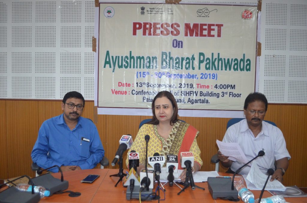 নিজস্ব প্রতিনিধি, আগরতলা, ১৩ সেপ্ঢেম্বর৷৷ রাজ্যেপ্রায় ৫ লক্ষ সুবিধাভোগী আয়ুষ্মান ভারত প্রকল্পে অন্তর্ভুক্ত হয়েছেন৷ আরও ১৫ লক্ষ সুবিধাভোগী ওই প্রকল্পে অন্তর্ভুক্ত হবেন৷ তাঁরা চিকিৎসার জন্য বছরে ৫ লক্ষ টাকা পর্যন্ত ক্যাশলেস সহায়তা পাবেন৷ ওই প্রকল্পের বর্ষপূর্তি উপলক্ষ্যে সারা দেশের সাথে সাজুয্য রেখে ত্রিপুরায়ও আয়ুষ্মান ভারত পক্ষকালব্যাপী অনুষ্ঠানের আয়োজন করা হয়েছে৷ শুক্রবার সাংবাদিক সম্মেলনে এ-কথা জানান জাতীয় স্বাস্থ্য মিশনের মিশন ডিরেক্টর অদিতি মজুমদার৷