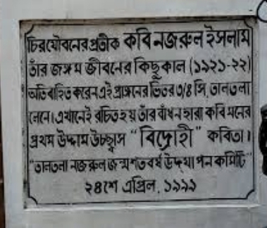 ১০০ বছর আগে নজরুল কবিতাটি লেখেন কলকাতায় তালতলা লেনের এক বাড়িতে বসে। সেই বাড়ির প্রবেশপথের পাশে ফলকে লেখা আছে, “চিরযৌবনের প্রতীক কবি নজরুল ইসলাম তাঁর ডঙ্গম জীবনের কিছুকাল (১৯২১-২২) অতিবাহিত করেন এই প্রাঙ্গণের ভিতর ৩/৪ সি তালতলা লেনে। এখানেই রচিত হয় তাঁর বাঁধনহারা কবিমনের প্রথম উদ্দাম উচ্ছাস ‘বিদ্রোহী‘ কবিতা। তালতলা নজরুল জন্ম শতবর্ষ কমিটি। ২৪ শে এপ্রিল, ১৯৯৯। “