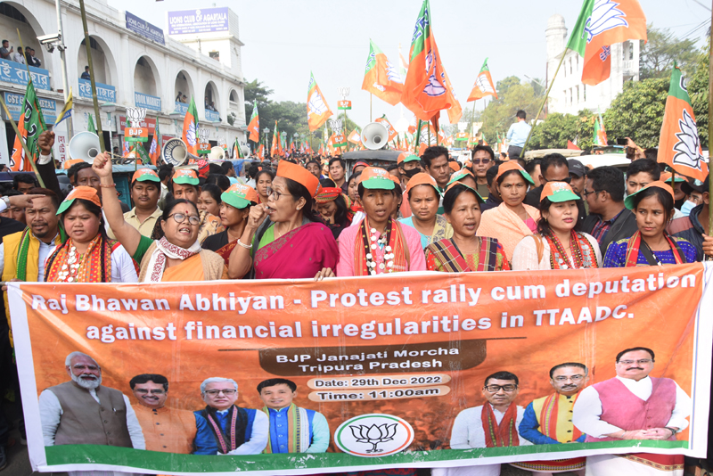 আজ জনজাতি মোর্চার উদ্যোগে রাজভবন অভিযান অনুষ্ঠিত হয়েছে। বিশাল মিছিল নিয়ে জনজাতি মোর্চা রাজ্যপালের কাছে এডিসি প্রশাসনের বিরুদ্ধে অনিয়মের অভিযোগ এনে মেমোরেন্ডম দিয়েছে। ওই মিছিলে ত্রিপুরার প্রাক্তন মুখ্যমন্ত্রী তথা সাংসদ বিপ্লব কুমার দেব, বিজেপি প্রদেশ সভাপতি রাজীব ভট্টাচার্য, সাংসদ রেবতী ত্রিপুরা, মন্ত্রী সান্তনা চাকমা, বিজেপি সহসভাপতি পাতাল কন্যা জমাতিয়া সহ অন্যান্যরা উপস্থিত ছিলেন। মিছিল শহরের বিভিন্ন পথ পরিক্রমা করে সার্কিট হাউসে গিয়ে জনসভায় যোগ দিয়েছে। মিছিল থেকে এক প্রতিনিধি দল রাজ্যপালের কাছে মেমোরেন্ডম জমা দিতে গেছেন।