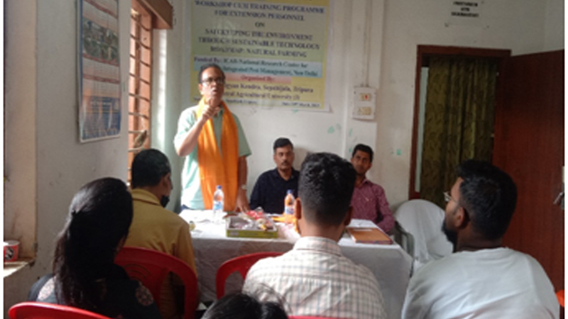 আগরতলা, ৭ এপ্রিল: কৃষি বিজ্ঞান কেন্দ্র, সিপাহীজলা, কেন্দ্রীয় কৃষি বিশ্ববিদ্যালয় (ইম্ফল),লাটিয়াছেরার উদ্যোগে ডঃ মুকেশ মুকেশ সেহগাল প্রধান বিজ্ঞানী, আইসিএআর-NCIPM, নয়াদিল্লি প্রযুক্তিগত নির্দেশনায় সম্প্রতি ৩০শে মার্চ, ২০২৩ ইং বিশ্রামগঞ্জে স্থিতিশীল প্রযুক্তি রোডম্যাপের মাধ্যমে পরিবেশ রক্ষা করা: প্রাকৃতিক চাষ বিষয়ক ওয়ার্কশপ সহ প্রশিক্ষন কর্মসূচী অনুষ্ঠিত হয়। অনুষ্ঠানটি ডঃ অনুপম মিশ্র, মাননীয় ভাইস-চ্যান্সেলর, কেন্দ্রীয় কৃষি বিশ্ববিদ্যালয়, ইম্ফলের নির্দেশনায় পরিচালিত হয়। এই কর্মসূচির উদ্দেশ্য ছিল রাসায়নিক সার ও কীটনাশকের ব্যবহার কমানো, নির্বিচারে ব্যবহার যা পরিবেশকে দূষিত করে, এবং ভাল কৃষিবিদ্যার চর্চাকে উন্নত করা।