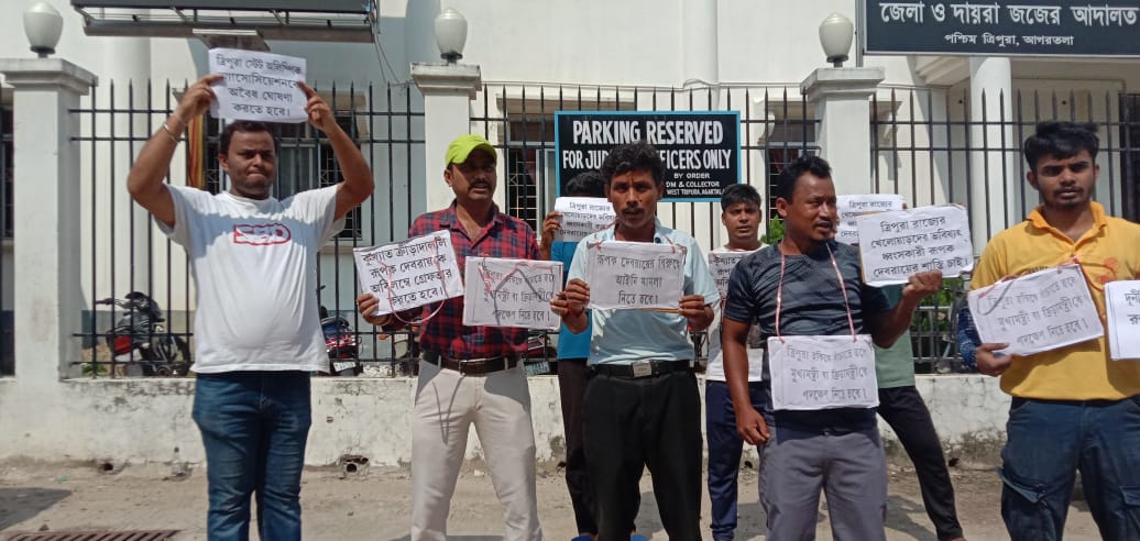 কোর্ট চত্বরে রূপক দেবরায়ের বিরুদ্ধে প্ল্যা-কার্ডে ক্ষোভ প্রদর্শন