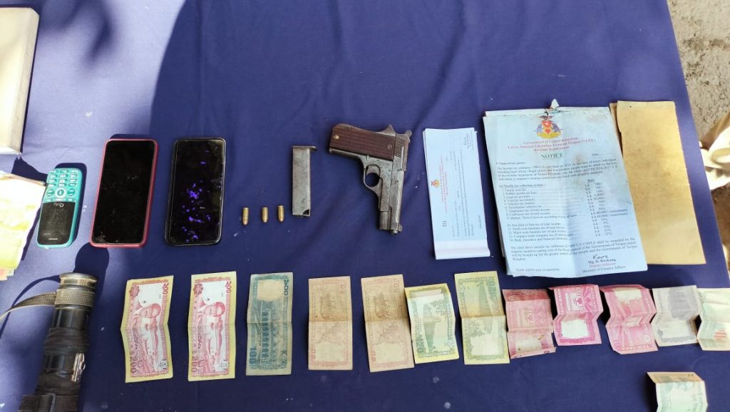 তাঁদের কাছ থেকে একটি চাইনিজ পিস্তল, তিন রাউন্ড তাজা কার্তুজ, তিনটি মোবাইল, এনএলএফটির রশিদ ও নোটিশ, ভারতীয় মুদ্রায় ৩৩৬০ টাকা এবং বাংলাদেশী মুদ্রায় ৬৭৯ টাকা উদ্ধার হয়েছে। তাঁদের নাম মানিকরায় পাড়ার বাসিন্সদা এসএস মেজর গণরায় রিয়াং(৩৮), ভাগীচন্দ্র পাড়ার বাসিন্দা রায়বাহাদুর রিয়াং(৪৫), এবং খাসনাম শরণার্থী শিবিরের বাসিন্দা আশ্রয়দাতা রায়তানহিয়া রিয়াং(৩৭)-কে গ্রেফতার করেছে পুলিশ। তাঁদের বিরুদ্ধে সুনির্দিষ্ট মামলা দায়ের করে জিজ্ঞাসাবাদ চালানো হয়েছে বলে জানিয়েছেন উত্তর ত্রিপুরা জেলা পুলিশ সুপার। তিনি বলেন, ধৃত দুই বৈরীর মধ্যে একজন সদ্য এনএলএফটি উগ্রপন্থী দলে যোগ দিয়েছেন।