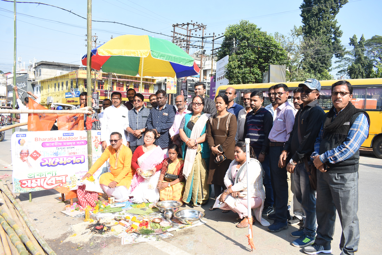আগামী ২৩ এবং ২৪ ডিসেম্বর ভারতীয় মজদুর সংঘের তৃতীয় ত্রি-বার্ষিক রাজ্য সম্মেলনের আয়োজন করা হয়েছে। সম্মেলনকে সামনে রেখে বুধবার রাজধানীর রবীন্দ্র ভবনের সামনে ভূমি পূজা করা হয়। ভারতীয় মজদুর সংঘ ত্রিপুরা রাজ্য কমিটির সাধারন সম্পাদক তপন কুমার দেব জানান ভারতীয় মজদুর সংঘের তিন বছর পর পর সম্মেলন হয়ে থাকে। এই সম্মেলনে সংগঠনের সর্বভারতীয় নেতৃত্বরা উপস্থিত থাকেন।