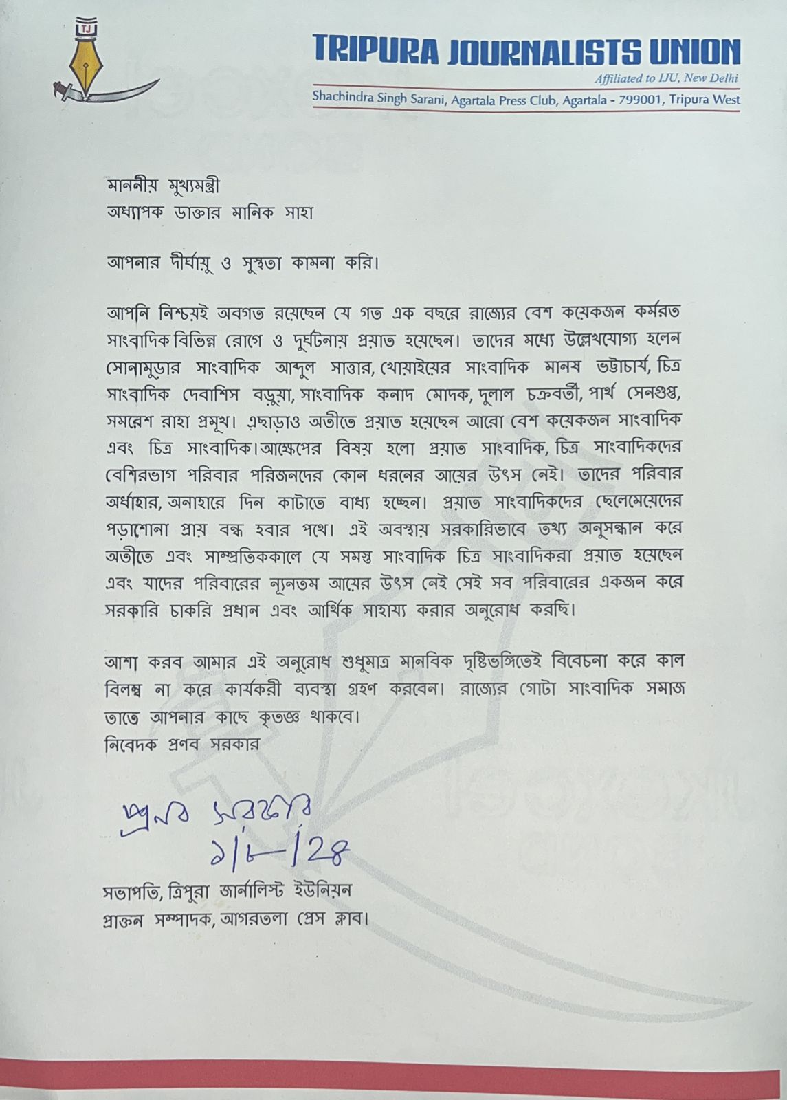 প্রয়াত সাংবাদিকদের পরিবারের একজনকে চাকুরি এবং আর্থিক সাহায্য প্রদানের দাবি জানালো ত্রিপুরা জার্নালিস্ট ইউনিয়ন