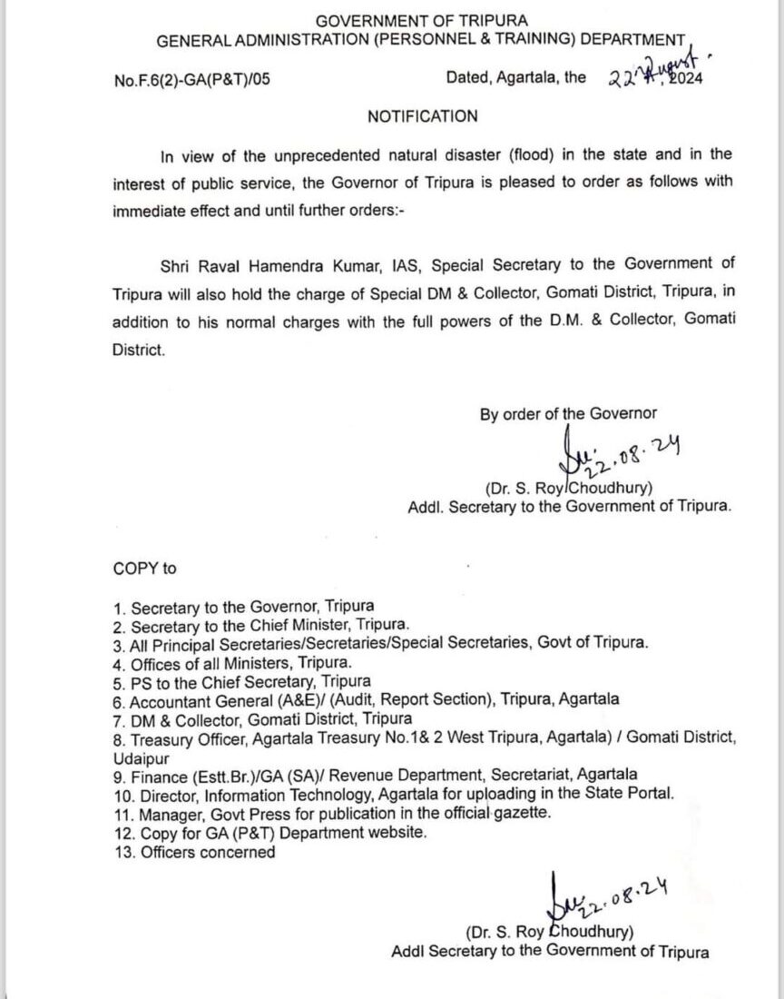 গোমতি জেলায় বন্যা পরিস্থিতি, আধিকারিক রাভেল হেমেন্দ্র কুমারকে দায়িত্ব দেওয়া হয়েছে জেলা শাসক হিসেবে