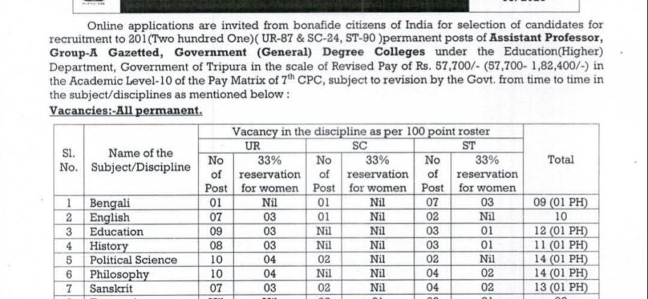 আগরতলা, ৩১ জানুয়ারি: রাজ্যের কলেজগুলোতে বিভিন্ন বিভাগে ২০১ জন অ্যাসিস্ট্যান্ট প্রফেসর পদে নিয়োগের করার বিজ্ঞপ্তি প্রকাশ করেছে টিপিএসসি।