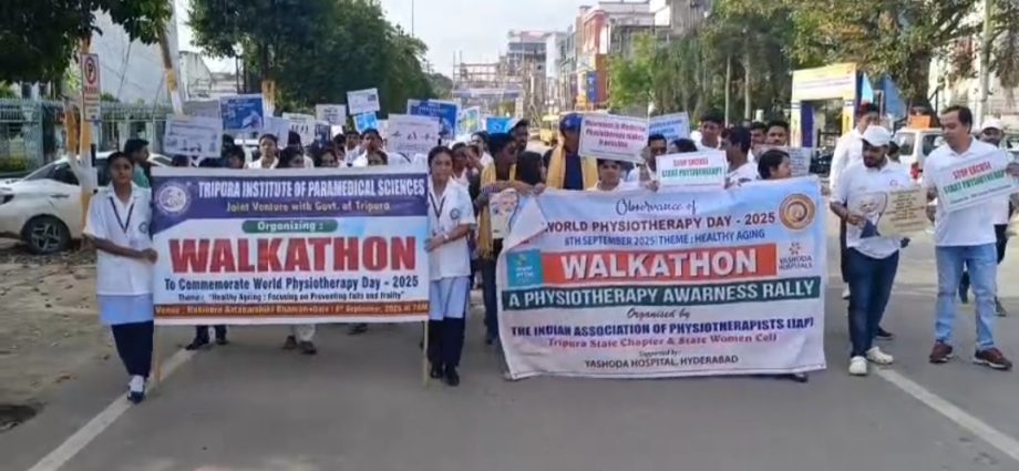 আগরতলা, ৮ সেপ্টেম্বর : বিশ্ব ফিজিওথেরাপি দিবস উপলক্ষে দা ইন্ডিয়ান এসোসিয়েশন অফ ফিজিওথেরাপিস্ট ত্রিপুরা শাখা ও ত্রিপুরা ইনস্টিটিউট অফ প্যারামেডিকেল সাইন্স যৌথ উদ্যোগে শহরে পদযাত্রা অনুষ্ঠিত হয়েছে। যার মূল উদ্দেশ্য হলো সাধারণ মানুষকে ফিজিওথেরাপি বিষয়ে অবগতি করা। এদিনের পদযাত্রা রবীন্দ্র শতবার্ষিকী ভবনের সামনে থেকে শুরু হয়ে শহরের বিভিন্ন পথ পরিক্রমা করে।