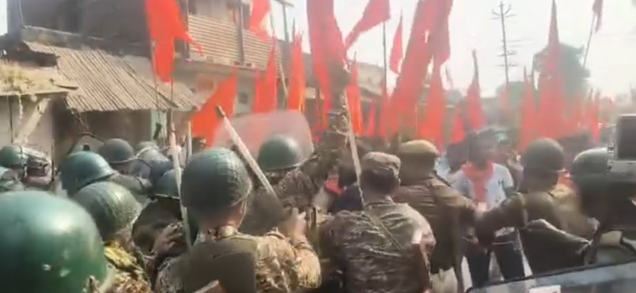 নিজস্ব প্রতিনিধি, আগরতলা, ১২ জানুয়ারি: বাংলাদেশে সংখ্যালঘু হিন্দুদের উপর নির্যাতনের প্রতিবাদে খোয়াইয়ে বিশ্ব হিন্দু পরিষদের বিক্ষোভ মিছিল বাংলাদেশে সংখ্যালঘু হিন্দু সম্প্রদায়ের উপর নির্যাতন ও ধারাবাহিক আক্রমণের ঘটনার প্রতিবাদ জানিয়ে আজ খোয়াইয়ে বিশ্ব হিন্দু পরিষদ-এর উদ্যোগে এক প্রতিবাদ বিক্ষোভ মিছিল অনুষ্ঠিত হয়। মিছিলে জেলা কমিটির পাশাপাশি বজরং দল-সহ বিপুল সংখ্যক হিন্দু সনাতনী সমাজের মানুষ অংশগ্রহণ করেন। এদিকে মিছিলটিকে আটকে দেয় বিএসএফ, পুলিশ ও সেন্ট্রাল রিজার্ভ পুলিশ ফোর্স-এর জওয়ান। এতে এক সময় নিরাপত্তা জওয়ানদের সাথে ধস্তাধস্তি শুরু হয় আন্দোলনকারীদের। যদিও পরে প্রশাসনিক হস্তক্ষেপে পরিস্থিতি নিয়ন্ত্রণে আসে।