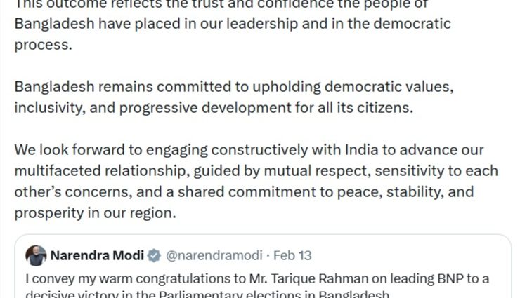 এক্স-এ পোস্ট করে বিএনপি জানায়, প্রধানমন্ত্রী নরেন্দ্র মোদিকে আন্তরিক ধন্যবাদ। বিএনপির নির্ণায়ক জয়ে জনাব তারেক রহমানের নেতৃত্বকে স্বীকৃতি জানানোর জন্য আমরা কৃতজ্ঞ। এই ফলাফল বাংলাদেশের মানুষের আস্থা ও বিশ্বাসের প্রতিফলন। দলটি আরও জানায়, বাংলাদেশ গণতান্ত্রিক মূল্যবোধ, অন্তর্ভুক্তিমূলক নীতি এবং প্রগতিশীল উন্নয়নের প্রতিশ্রুতি রক্ষা করবে।