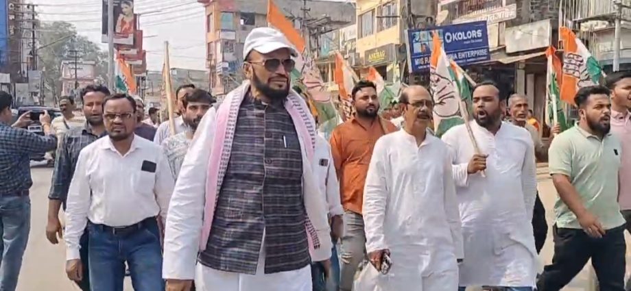 কৈলাসহর, ২৫ ফেব্রুয়ারি: যুব কংগ্রেসের সর্বভারতীয় সভাপতি উদয় ভানু চিব-এর গ্রেপ্তার, কংগ্রেস নেতা রাহুল গান্ধী-কে প্রাণনাশের হুমকি এবং সংসদে বিরোধী দলনেতাকে কথা বলতে না দেওয়ার অভিযোগে কেন্দ্রীয় সরকারের বিরুদ্ধে তীব্র প্রতিবাদ জানাল জেলা ও ব্লক যুব কংগ্রেস। আজ কৈলাসহর শহরে সংগঠনের উদ্যোগে এক বিক্ষোভ মিছিল অনুষ্ঠিত হয়।মিছিলটি জেলা কংগ্রেস ভবন থেকে শুরু হয়ে শহরের বিভিন্ন গুরুত্বপূর্ণ সড়ক পরিক্রমা করে পুনরায় জেলা কংগ্রেস ভবনে এসে শেষ হয়। বিক্ষোভে অংশগ্রহণকারীরা বিভিন্ন স্লোগানের মাধ্যমে কেন্দ্রীয় সরকারের বিরুদ্ধে ক্ষোভ উগরে দেন এবং উদয় ভানু চিবের অবিলম্বে মুক্তির দাবি তোলেন।