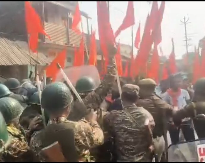 বাংলাদেশে সংখ্যালঘুদের উপর নির্যাতনের প্রতিবাদে খোয়াইয়ে বিশ্বহিন্দু পরিষদের বিক্ষোভ মিছিল, বিক্ষোভকারীদের সাথে ধস্তাধস্তি পুলিশের